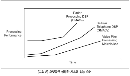 DSP 및 패킷 프로세싱 시스템을 위한 성능요건은 그림 8에 나타낸 것처럼 최종 고객의 요구에 따라 갈수록 증가하고 있다.