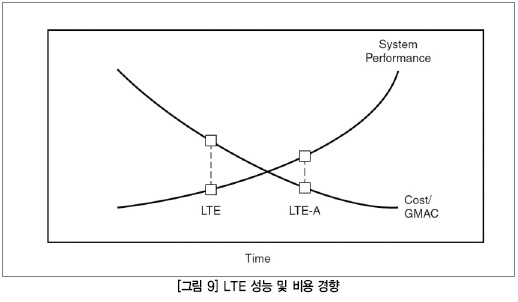 노이즈에서 탁월한 신호 정보를 추출하고, 항상 실제와 같은 이미지를 생성하고, 끝없이 증가하는 패킷 트래픽의 처리에 대한 요구는 이러한 성능요건의 증가를 이끌고 있다. 또한 이러한 성능요구는 항상 달성 가능한 실용적인 한계선 안에서 경제적인 방안으로 처리되어야 한다. 그림 9는 LTE 및 LTE-A(LTE-Advanced) 기지국의 시간이 경과하면서 나타나는 성능 대비 비용 흐름을 보여주고 있다.
