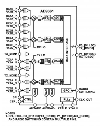AD9361은 70 MHz ~ 6 GHz의 주파수 대역에서 동작하며, 단일 칩에 여러 기능을 통합했다. 또한 RF 프런트엔드와 유연한 혼합신호 베이스밴드 섹션, 주파수 합성기, 독립적인 2채널 A/D 컨버터와 직접 변환 수신기를 통합해 설계를 간소화하고 BOM을 줄여준다. 특히 AD9361은 200 kHz 미만부터 56 MHz까지의 넓은 채널 대역폭을 지원한다. 두 대의 독립적인 직접 변환 수신기는 가장 이상적인 잡음 수준과 선형성을 자랑한다. 각 수신 서브시스템은 독립적인 자동 이득 제어, DC 오프셋 보정, 쿼드러쳐 에러 보정, 디지털 필터링을 제공하기 때문에 디지털 베이스밴드에서는 이러한 기능이 필요하지 않다. AD9361은 외부에서 제어할 수 있는 유연한 수동 이득 제어 모드도 제공한다.