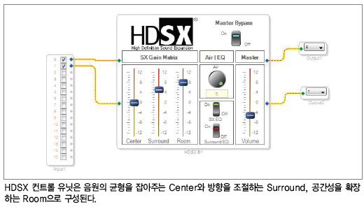 예를 들어 공연장의 객석은 위치에 따라 음향이 잘 들리거나 혹은, 잘 들리지 않는다. HDSX는 오리지널 음원의 다양한 음색을 하나하나 표현/확장해 위치에 따른 음향 문제를 해결할 수 있다. 더욱 쉽게 이야기하면 음향을 상하좌우로 넓힐 수 있다는 것이다. 이 같은 음원을 구현해내기 위해 중요한 것이 바로 컨트롤 유닛이다.