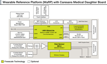 웨어러블 기준 플랫폼은 착용형 제품 시장의 중요한 기술적 과제인 연결, 사용성, 배터리 수명 및 소형화를 해결함으로써 개발을 가속화, 간소화해주므로 개발자는 차별화된 기능을 개발하는 데 집중할 수 있다. 이 플랫폼은 프리스케일의 i.MX 6 솔로라이트 ARM® 코어텍스®-A9(i.MX 6SoloLite ARM® Cortex®-A9) 애플리케이션 프로세서를 핵심 처리 장치로 하며 안드로이드 OS를 지원하고 양산급 반도체, 소프트웨어 및 하드웨어를 통합했다. 또한 BOM에 최적화된 하이브리드 아키텍처에는 프리스케일의 익스트린직(Xtrinsic) MMA9553 턴키 만보계, 수상 경력에 빛나는 FXOS8700 전자 나침반 및 ARM 코어텍스-M0+ 키네티스 KL16(ARM Cortex-M0+ Kinetis KL16) 마이크로 컨트롤러도 탑재했다.