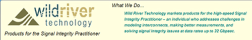 와일드 리버 테크놀로지(WRT: Wild River Technology)는 인터커넥트, 시간 및 주파수 영역 측정, 지터 분석을 모델링할 때 문제를 해결하는 고속 신호 무결성 설계자를 위한 제품을 공급하고 있다. WRT 제품들은 6 ~ 32 Gbpsec 범위의 신호 무결성 문제를 다루고 있다. 이 회사의 제품 포트폴리오는 고속 설계 환경에서 다년간 연구한 결과물이다. CMP 제품군, 어댑터, 케이블, 측정 작업공간 제품의 목적은 SI 실행 단계를 향상시키고 엔지니어의 자신감을 향상시켜 비싼 설계 주기 변경을 감소시키기 위함이다. 상세 정보는 www.WildRiverTech.com에서 참조할 수 있다.