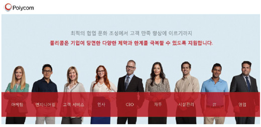 폴리콤이 영상 협업 솔루션을 통해 기업 내의 다양한 부서에서 당면하는 제약과 한계를 극복하고 조직 전체의 업무 효율성을 혁신적으로 개선하는 방안을 제시하는 ‘Defy Distance 캠페인’을 진행했다. 폴리콤의 ‘Defy Distance 캠페인’은 전 세계 잠재 고객 및 기존 고객들을 대상으로 진행하는 연간 캠페인으로 기업 내의 마케팅과 엔지니어링, 고객서비스, 인사, CEO, 재무, 시설관리, IT 부서 등 여러 업무 분야에 걸쳐 영상 협업 솔루션에 대한 활용 방안과 혜택, 기대 효과 등을 소개한다. 특히 캠페인을 통해 그동안 신뢰성 있는 조사 기관과 함께 전 세계 고객을 대상으로 진행한 실질적인 설문 조사 결과 및 보고서, 동영상 등 다양한 정보와 자료를 제공함으로써 현재 영상 협업을 사용하는 고객과 잠재 고객이 어떻게 영상 협업의 효과를 극대화하고 그 혜택을 활용할 수 있는지에 대해 제안한다.
