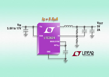 리니어 테크놀로지 코리아(대표 홍사곽)는 고효율의 17V 입력이 가능한 동기식 벅 레귤레이터(제품명: LTC3624)를 출시했다고 밝혔다. 이 제품은 0.6V까지 낮은 출력 전압으로 설정가능하며 최고 2A의 연속 출력 전류를 제공한다. 동기식 정류는 최대 95%의 높은 효율을 제공하며, 버스트 모드(Burst Mode®) 동작은 무부하 대기 전류가 3.5µA에 불과하다.