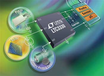 LTC3330은 레귤레이터를 결합한 포괄적인 에너지 포집 솔루션으로 포집 에너지를 이용해서 최대 125 mA의 연속 출력 전류를 공급할 수 있으며 배터리 수명을 연장할 수 있다. 이 디바이스는 포집된 에너지에서 부하로 레귤레이트 전력을 공급할 때는 배터리로부터의 공급 전류가 필요하지 않으며 무부하 조건의 배터리로 구동될 때는 동작을 위해 750 nA만을 필요로 한다. LTC3330은 고전압 에너지 포집 전력 공급과 일차전지로 작동되는 동기 벅-부스트 DC/DC 컨버터를 결합해 무선 센서 네트워크와 같은 에너지 포집 애플리케이션에 이용하도록 단일의 중단 없는 출력을 제공한다.
