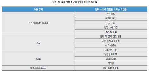 WSN을 구현 시에 반드시 고려해야 할 중요한 질문이 있다. 바로 ‘시스템을 가동하기 위해서 얼마나 많은 전력을 필요로 하는가?’라는 것이다. 개념적으로는 아주 간단해 보일 수 있지만, 실제로는 여러 가지 요인이 영향을 미쳐 간단치만은 않은 질문이다. 예를 들어 리딩을 얼마나 빈번하게 실시할 것인가? 또는 좀 더 중요한 사항으로서, 데이터 패킷을 얼마나 크게 할 것이며 얼마나 멀리까지 전송해야 할 것인가? 이는 단일 센서 리딩을 위해 시스템에 사용하는 에너지의 약 50%를 트랜시버가 소모하기 때문이다. 그 외에도 다양한 요인들이 에너지 포집 시스템을 이용한 WSN의 전력 소모 특성에 영향을 미친다(표 1 참조).