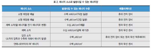 주변 에너지 자원은 빛과 온도 차이, 진동 빔, 송신된 RF 신호, 그 밖에 트랜스듀서를 통해서 전기 전하를 발생시킬 수 있는 어떤 유형의 형태나 될 수 있다. 표 2는 각기 다른 에너지 소스로 발생시킬 수 있는 에너지양을 보여준다.