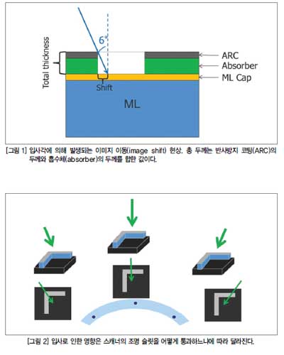 웨이퍼 수준에서 마스크 섀도우잉 효과는 조명 스캐너 슬릿을 통해 CD 변이를 발생하며 왜곡 정도는 전사되어야 하는 피처(feature)의 방향과 위치에 좌우된다. 현재의 입사각은 법선으로부터 6 °로써 그 방위각이 변화한다. 이 각도는 스캐너의 조명 슬릿을 따라 67 °에서 123 °까지 변화한다. 이러한 비등축 조명이 섀도우잉 효과를 발생하는 이유는 그림 1에서 보듯이 마스크의 두께가 있기 때문이다.
