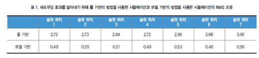 서로 다른 슬릿 위치들에서 그림 3b와 그림 3c의 데이터로부터 계산된 RMS 오류를 비교하면 모델 기반의 방법을 이용해 슬릿 전면의 섀도우잉 효과를 알아내는 쪽이 상당한 이점이 있음을 알 수 있다.