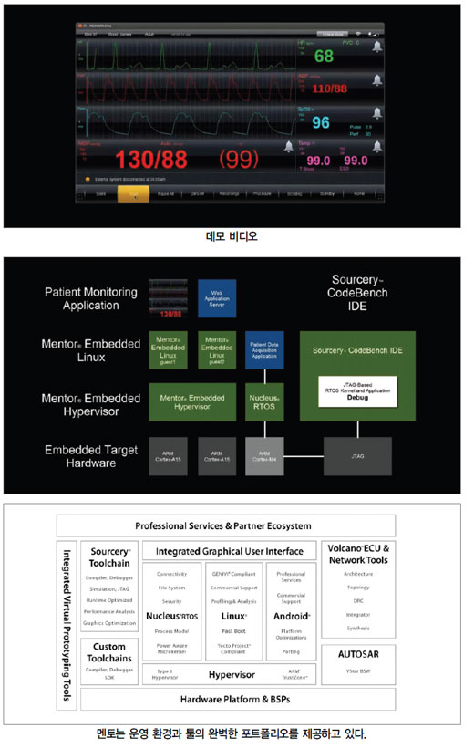 기존 병원 시스템은 RTOS나 베어 메탈 애플리케이션을 사용해 환자의 상태를 파악했다. 이후 다양한 운영체제가 내재된 모니터링 시스템으로 의사나 간호사가 이를 확인했다. 하지만 각각의 환경별로 개발자와 운영체제가 달랐다. 멘토가 구현한 통합 개발 솔루션은 리눅스 플랫폼과 Nucleus RTOS 및 베어 메탈 애플리케이션을 포함하는 다중 운영체제 디바이스의 구성과 배치 및 시스템 최적화를 포함한다. 또한 분리된 디바이스 서브시스템들 간의 효율적인 프로세서 간 통신(IPC) 기능을 제공하기 위해 운영체제 전반에 걸친 VirIO, rpmsg 및 멀티코어 통신 API(MCAPI)의 확장을 할 수 있다.