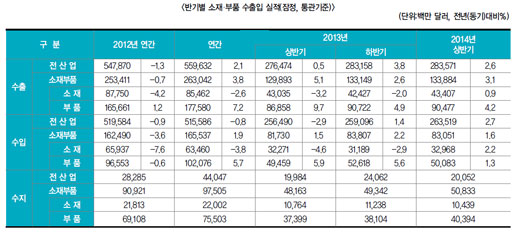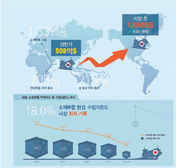 2014년 상반기 소재,부품무역흑자는 508억 달러로 사상 최고치를 기록했다. 산업통상자원부는 지난달 무역흑자가 반기 기준, 사상 첫 500억 달러를 돌파했으며 올해 ‘무역흑자 1,000억 달러 시대’가 열릴 것으로 내다봤다.