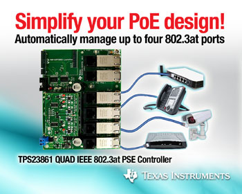 TI(대표 이사 켄트 전)는 빠르게 성장하고 있는 PoE(Power over Ethernet) 애플리케이션 설계를 간소화할 수 있도록 지원하는 새로운 TPS23861 PoE 컨트롤러 기반의 2레이어 PoE PSE(power sourcing equipment) 평가 모듈과 TI 디자인을 출시했다. 이 고성능 쿼드 포트 컨트롤러와 레퍼런스 디자인은 PoE를 탑재한 네트워크 비디오 레코더, IP 전화 스위치 및 무선 기지국 개발 시간과 비용을 크게 줄여준다. (보다 자세한 내용 및 샘플 주문은 www.ti.com/poedesign-pr-kr 참조.)
