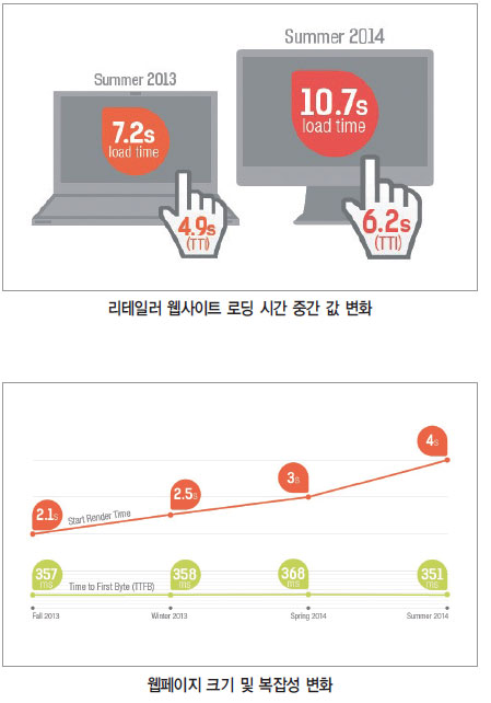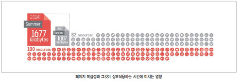 - 성능 저하의 주요 요인인 페이지 규모 및 복잡성: 웹페이지는 1년 사이 1007 KB(킬로바이트)에서 1677 KB로 67%로 증가했다. 2013년 웹페이지는 82개의 리소스 리퀘스트를 포함했으며 최근에는 100개를 포함했다. 대부분의 이러한 규모 및 복잡성 증가는 페이지 분석과 트래킹 비콘(tracking beacons) 및 소셜 버튼(social buttons) 등 낮은 수준의 최적화된 이미지 및 써드파티 스크립트의 폭발적인 증가 때문으로 나타났다.