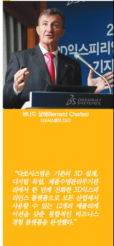 다쏘시스템코리아는 지난달 밀레니엄 서울힐튼호텔에서 경제를 선도하기 위한 더욱 강화된 비즈니스 경험 플랫폼 전략을 발표했다. 이날 다쏘시스템의 버나드 샬레(Bernard Charles) CEO는 “기업의 제품 디자인과 생산, 서비스 방식을 혁신하기 위해 3D익스피리언스 플랫폼과 클라우드 서비스 연계를 강화할 예정”이라고 말했다.