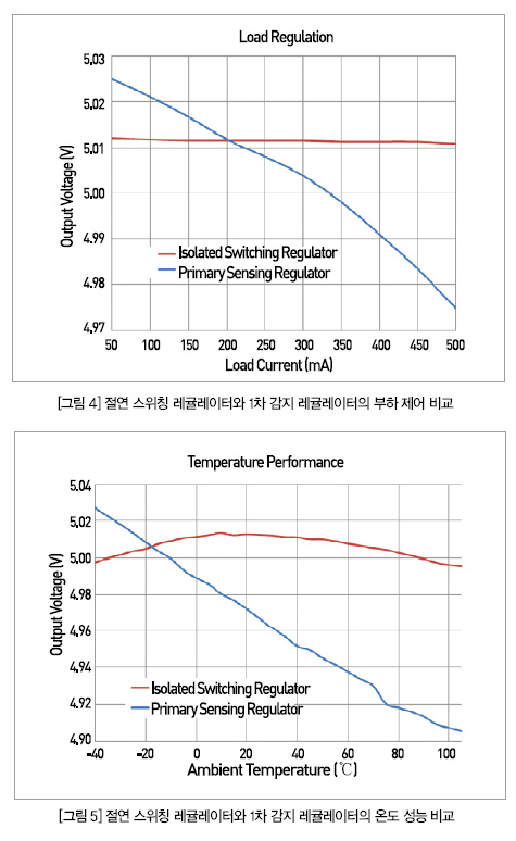 통합 피드백을 사용하는 절연 스위칭 레귤레이터가 1차 감지 레귤레이터보다 뛰어나다는 사실은 성능곡선을 보면 알수 있다. 부하 조정 특징을 나타낸 그림4를 보면, 절연 스위칭 레귤레이터의 전류가 50~500 mA 일 때 출력 전압은 변화량이 1 mV 내외로 거의 일정한 값을 가진다. 비교해보면, 동일한 부하 조건에서 1차 감지 레귤레이터의 출력 변화는 50 mV가 넘는다.