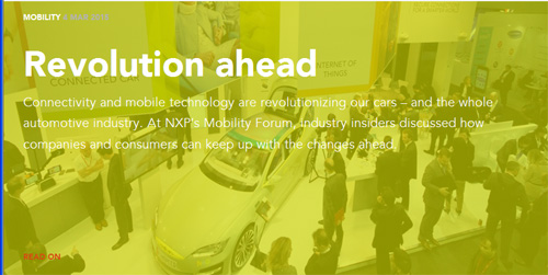 바르셀로나에서 개최되는 모바일 월드 콩그레스(Mobile World Congress)에서 ‘도시의 삶 & 내일의 스마트 도시(Urban Living and the Smart Cities of Tomorrow)’라는 주제로 열린 NXP의 패널 토론에서 스마트 시티에 대한 논의가 있었다. 아우디 도시 미래 이니셔티브(Audi Urban Future Initiative)에 참여하고 있는 벤 해머슬리(Ben Hammersley) 와 소피 스티글리아노(Sophie Stigliano) 같은 유명 전문가들이 홀7E30에 위치한 NXP 부스에서 스마트 시티의 과제를 논의했다. 웹사이트(www.nxp.com/mwc2015)에서 보다 상세한 추가 정보를 확인 할 수 있다.