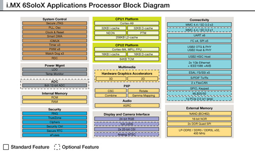 ARM® Cortex®-M4와 Cortex-A9 코어가 같은 칩에 통합되어 있어 Cortex-A9 코어에 사용자 인터페이스가 풍부한 운영 체제를 배포하면서 Cortex-M4 코어의 확정적 실시간 응답성의 장점도 누릴 수 있다. 별도의 CPU 코어 전력 도메인에 의해 독립적인 전력 상태 제어가 가능하고 전류 유출이 낮으며 대기 모드에서 빠른 재가동이 가능하다.