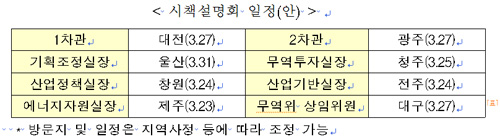1․2차관을 비롯한 1급 이상 산업부 간부는 3. 23. 제주도를 시작으로 전국 주요 시․도를 직접 찾아가 지역산업 활성화 방안과 FTA 활용촉진방안 등 2015년 주요 정책을 설명한다.