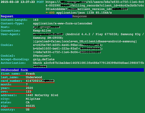 공격자는 유명한 온라인 쇼핑몰을 이용하는 사람들의 로그인 정보와 신용카드 정보를 훔치기 위해 프릭 공격을 할 수 있다. 민감한 개인정보를 포함하는 의료용 앱, 생산성 앱, 그리고 금융 관련 앱 등이 해당된다. 아래의 공격 시나리오 장면은 프릭 공격자가 암호를 해독한 후의 보안에 취약한 앱, 그리고 이 앱과 연결된 서버와의 명확한 평문 형태의 커뮤니케이션을 나타내고 있다.