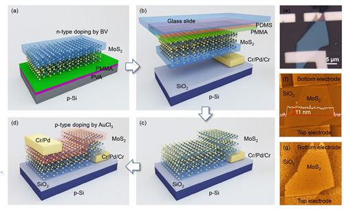 연구팀은 기존 3차원(3D) 구조의 규소로 만들어지는 반도체 소자와 달리 2차원(2D) 구조를 갖는 소재인 황화몰리브데늄(MoS2)을 반도체 소재로 활용하여 수직형 p-n 접합소자를 제작하는데 성공했다.