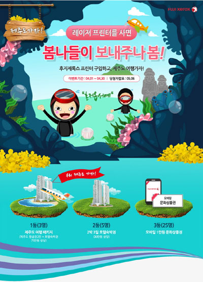 이번 봄맞이 기념 프로모션은 ▲흑백 레이저 복합기인 다큐프린트(DocuPrint) M115b, M115f, M215b, M215fw, ▲흑백 레이저 프린터 P115b, ▲컬러 레이저 복합기 CM115w, CM225fw, ▲컬러 레이저 프린터 CP115w와 CP225w 등을 대상으로 한다. 이벤트 기간 동안 오픈마켓(11번가, G마켓, 옥션)을 통해 프로모션 제품 구매 후, 후지제록스 프린터스 홈페이지 내 제품 등록을 마친 고객에게는 추첨을 통해 제주도 여행 패키지(3명), 호텔 숙박권(5명), 1만원권 모바일 문화상품권(25명)이 제공된다.