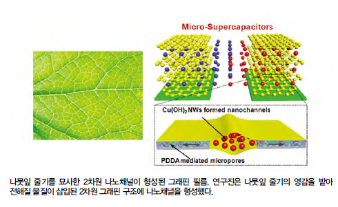 연구진은 나뭇잎 줄기의 구조에 착안해 이온 이동경로를 최대한 짧게 만들어 비표면적이 높은 그래핀 표면에 이온을 최대한 흡착시키는 구조를 만들었다