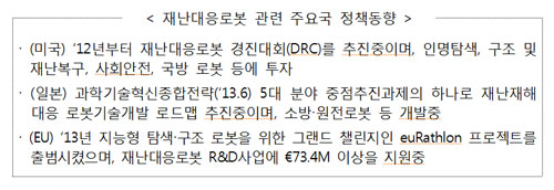 재난대응로봇은 현재 선도적인 기술 보유 국가가 없는 상황으로 미국, 일본, EU 등 선진국들은 관련 기술 확보 및 세계시장 선점을 위해 R&D, 경진대회 개최 등 다양한 전략적 투자를 진행중임