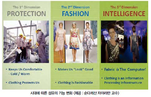 의류는 세 가지 형태를 거쳐 진화하고 있다. 첫째는 보호 목적을 위한 진화며, 둘째는 패션으로서의 진화다. 옷은 우리를 멋지게 보이도록 해주기 때문이다. 그리고 지금 의류는 세 번째 진화의 상태를 마주하고 있다. 바로 지능화(Intellegence)다. 옷이 하나의 중요한 정보 인프라가 되는 것이다. 이를 통해 섬유 자체는 컴퓨터가 된다. 실내온도가 높다고 느낀다면, 옷은 주변의 기기들과 커뮤니케이션함으로써 온도를 낮출 것이다. 인텔리전스인 동시에 컨버전스다. 여기서 컨버전스란 것은 정보 기술과 옷을 통합했다는 뜻이다. 옷이 웨어러블을 초월한 웨어러블이된 셈이다.