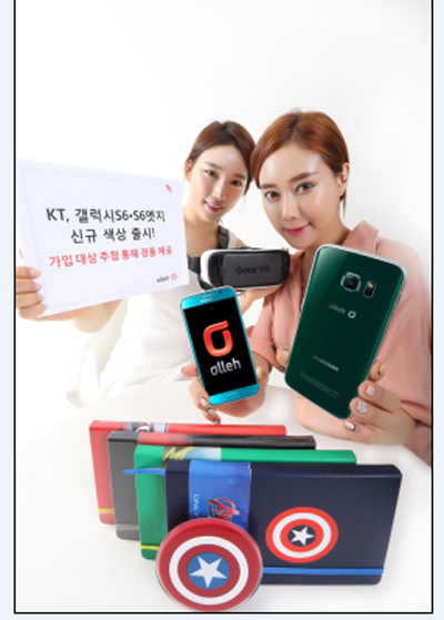 KT는 다음 달 7일까지 갤럭시S6 시리즈 블루’, 그린’ 모델을 개통한 고객이 다음 달 14일까지 이벤트 페이지(www.kt-galaxys6.com)에 응모할 경우, 기어VR for 갤럭시S6(60명), 어벤저스 무선충전기(300명), 그리고 어벤저스 에디션 노트(300명)를 제공할 예정이다.