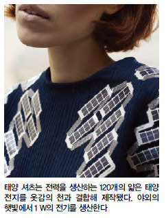 전력을 생산하는 120개의 얇은 태양 전지를 옷감의 천과 결합해 제작한 일명 ‘태양 셔츠(Solar Shirt)’는 야외의 햇빛에서 1 W의 전기를 생산한다.