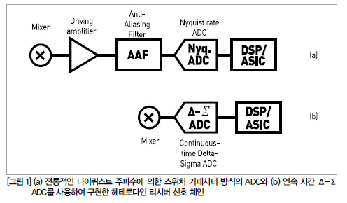 이를 더 잘 이해하기 위해 고전적인 통신 시스템용 헤테로다인(heterodyne) 수신기의 신호 체인을 예로 들어 생각해보자. 그림 1(a)는 메인 신호 패스에 스위치 커패시터, 나이퀴스트 속도를 지원하는 고속 ADC를 사용한 전통적인 방식을 보여준다. 여기에서, 믹서가 생성한 중간 주파수(IF) 신호는 버퍼나 신호 증폭기를 통과하게 된다. 나이퀴스트 ADC에는 이미지 신호를 제거하기 위한 AAF(Anti-Aliasing Filter)도 필요한데, 이는 종종 SAW 필터나 LC 소자를 이용하여 필터를 구현한다. 이 과정을 거쳐 원하는 무선 IF 신호는 ADC에 도달한다. AD 변환된 출력은 IF의 중심 주파수 보다 상당히 높은 샘플링 주파수로 클로킹되며 ADC 뒷단의 디지털 ASIC에서 추가 신호 처리를 통하여 주파수 하향 변환하거나 기저대역(Baseband)으로 변환된다.