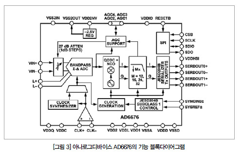 이러한 기술의 예는 그림 3에서 보듯이 아나로그디바이스 AD6676의 블록 다이어그램에서 확인할 수 있다. 블록 다이어그램에서 ADC 후반부에 존재하는 블록은 가변 밴드패스 CTDS를 내장하고 있는 통합 IF 디지털화 서브시스템을 나타낸 것으로서, 매우 높은 동작 영역의 신호를 처리하기 위한 디지털 필터링과 다운 변환 기능, 자동 이득 제어 기능, 집적화된 클록 생성기, 그리고 JESD204B 직렬 출력 인터페이스를 제공한다.