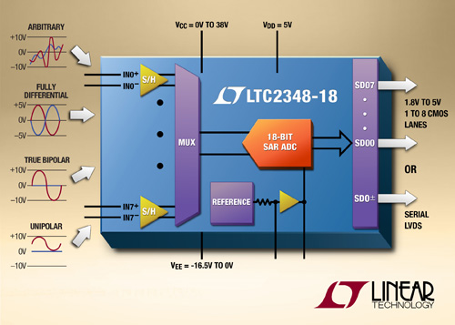리니어 테크놀로지 코리아(대표 홍사곽)는 업계를 선도하는 성능 및 유연성을 갖춘 18비트 8채널 동시 샘플링 SAR(successive approximation register) ADC(제품명: LTC2348-18)를 출시한다고 밝혔다. 이 제품은 채널 처리속도당 200ksps일 때 8개 채널을 변환시키면서, 각각의 SoftSpan™ 입력이 ±10.24V, 0V ~ 10.24V, ±5.12V, 또는 0V ~ 5.12V 신호를 수용할 수 있는 변환:변환(conversion-by-conversion) 바이어스로 독립적 구성이 가능하다.