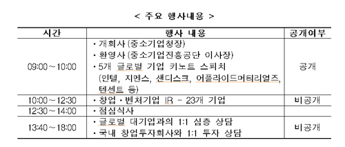 이번 행사는 인텔․지멘스․샌디스크․어플라이드머티리얼즈․텐센트 등 5개 글로벌 대기업들의 사업 방향과 인수합병(M&A) 전략, 벤처투자 전략, 최근 기술 경향 등에 대한 키노트(Keynote) 스피치를 시작으로 하여, 23개 창업․벤처기업이 글로벌 기업들 대상으로 기업 홍보(IR), 1:1 심층 만남을 통해 전략적 제휴, 인수합병, 투자유치에 대한 다양한 논의를 진행하였다.
