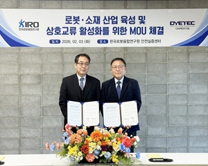 한국로봇융합연구원은 2월 3일 포항 KIRO 안전로봇실증센터에서 다이텍연구원과 ‘로봇·소재 산업 육성 및 상호교류 활성화를 위한 업무협약’을 체결했다고 밝혔다. 이번 협약은 로봇 산업의 고도화와 함께 중요성이 커지고 있는 소재·부품 기술 경쟁력을 강화하고, 연구 성과의 현장 적용을 위한 실증 기반 협력을 확대하기 위해 마련됐다.