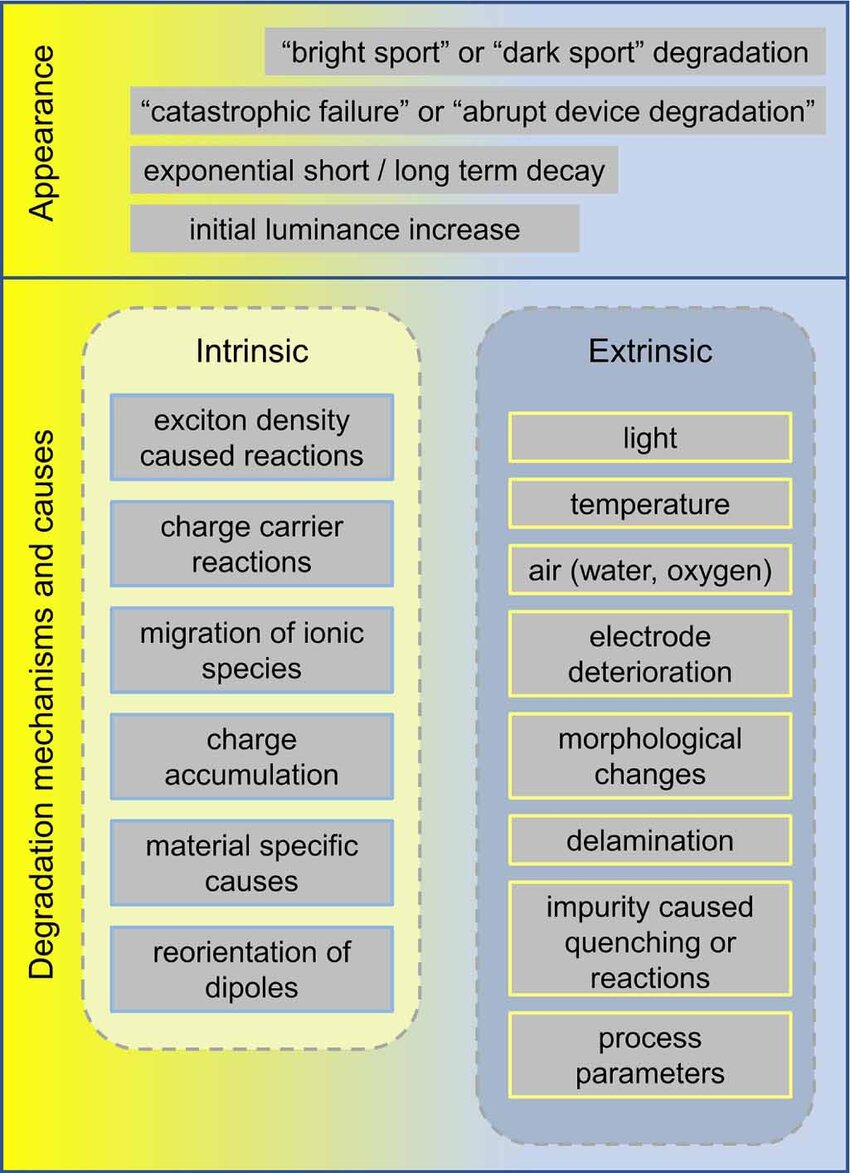 이러한 복합적인 열화 메커니즘은 단일 요인에 의해 발생하는 것이 아니라, 삼중항 여기자의 밀도, 유기 소재의 화학적 안정성, 소자의 구조적 특성 등 다양한 요소들이 상호작용함으로써 나타난다. 따라서 TADF OLED의 수명 향상을 위해서는 소재 분자의 구조적 안정성 확보, 계면에서의 전하 균형 제어, 그리고 구동 조건의 최적화 등 다각적인 접근이 필요하다. 이러한 열화 메커니즘의 분류 및 주요 원인들은 그림 2에 시각적으로 정리되어 있다.