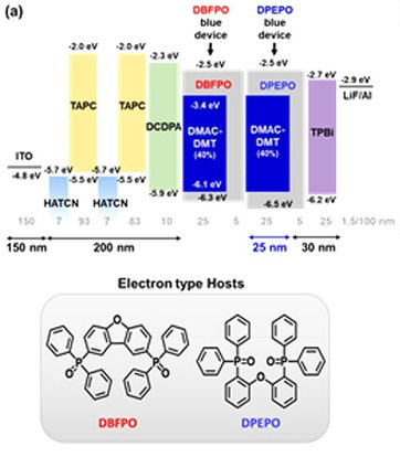 그림 3은 DBFPO와 DPEPO를 기반으로 한 TADF blue OLED에서 각 유기층 간의 에너지 밴드 정렬을 보여준다.