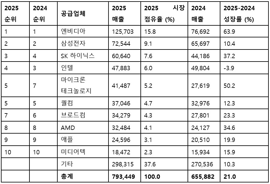삼성전자는 2위 자리를 유지했다. 메모리 부문 매출이 전년 대비 13% 늘며 전체 반도체 매출 730억 달러를 기록했지만, 비메모리 매출은 8% 감소했다. SK하이닉스는 2025년 매출 610억 달러를 기록하며 3위로 올라섰다. 이는 AI 서버용 HBM 수요 증가에 힘입어 전년 대비 37% 증가한 수치다. 인텔은 시장 점유율이 6%로 하락해, 2021년의 절반 수준까지 떨어졌다.